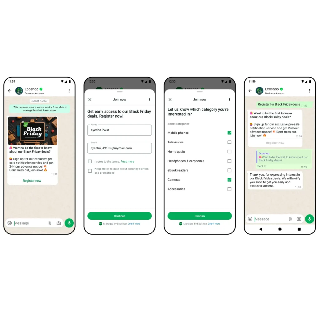 Use WhatsApp Forms to conduct surveys seamlessly. Collect feedback, preferences, or opinions from your audience.