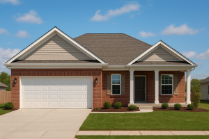 My house is small but very beautiful. It has only one floor and a lovely front yard filled with flowers. The walls are light cream, and the roof is grey, giving it a simple and peaceful look.