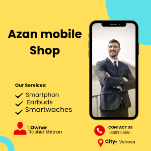 AzaN Mobile Shop Accessories Vehova ki sabse reliable aur trusted mobile accessories shop hai, jahan aapko latest, durable aur stylish mobile products reasonable prices par milte hain. Is shop ke owner Mr. Rashid Khitran hain, jo har customer ko best quality products aur honest dealing provide karne ke liye mashhoor hain.