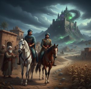 Ek roz sheher par andhera chha gaya — fasal sookh rahi thi, log pareshan the. Buzurgon ne bataya ke ye sab ek jadugarni ki wajah se ho raha hai. Jo bhi uska samna kare, uske raaste mein saat imtihan aayenge.Hatim ne maana aur nikal pada — saath tha uska wafadar dost Qasim. (ghodon ki kan-kan, qadam ki awaaz)Pehla imtihan — Sehra‑e‑Maya: