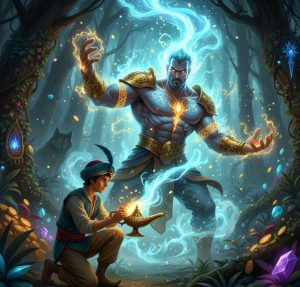 Ek din jungle me ghoomte hue usne dekha ek purana, dhool se bhara chirag. Jaise hi usne chirag saaf kiya, Arkaan, ek powerful jinn, zahir hua:> “Main Arkaan hoon. Jo bhi nek irada rakhe, uske sapne poore karunga.”Aladdin ne jawab diya:> “Mera maqsad sirf logon ki madad karna hai, apni khushi ke liye nahi.”Jinn ne muskuraya aur kaha:> “Toh chalo, tumhara safar shuru hota hai.”🏹 Safar aur Challenges1. Cave of Wonders